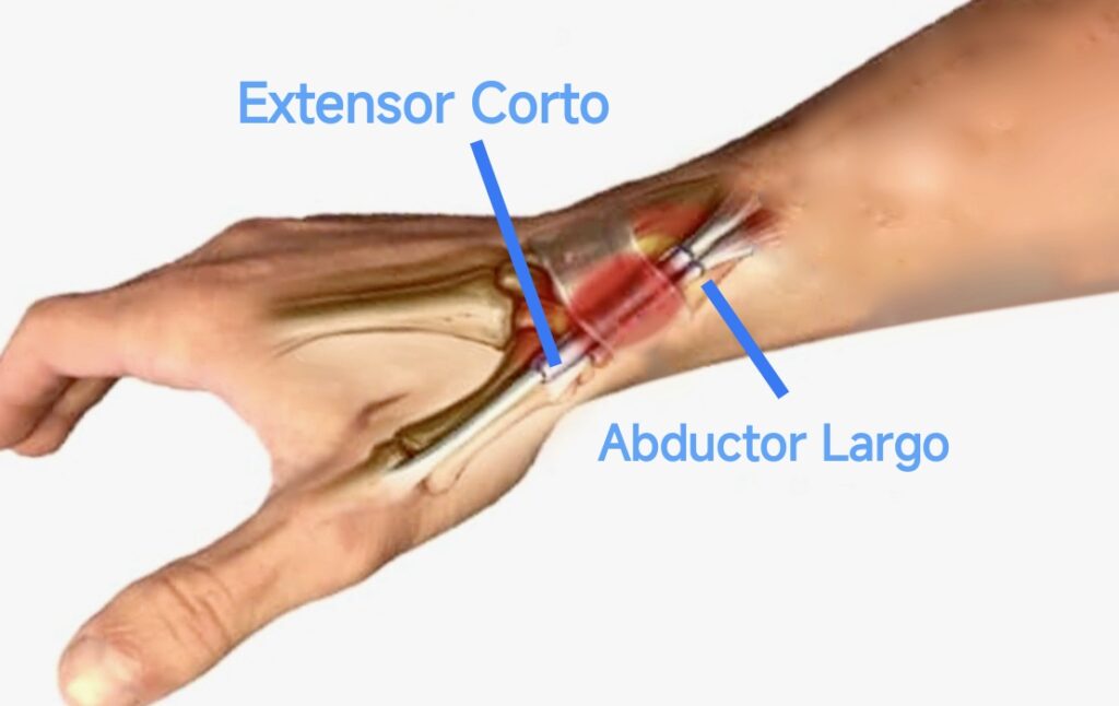 La Tendinitis o Tenosinovitis de Quervain es una afección en la que se produce dolor en el dorso de la muñeca, en la parte más cercana al dedo pulgar. Aunque se llama tendinitis, lo cierto es que el componente inflamatorio no siempre está.  Lo que predomina es un engrosamiento y cambios degenerativos en la vaina sinovial de dos tendones: el tendón del músculo Abductor Largo del Pulgar y el tendón del músculo Extensor Corto del Pulgar.